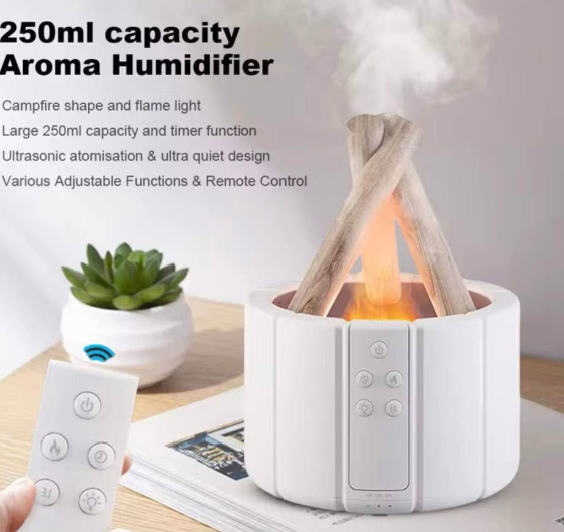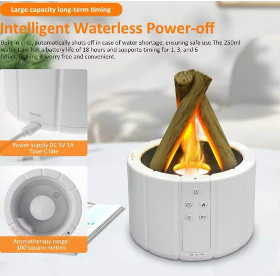 Efecto de Fogata Realista: La iluminación LED y la niebla se combinan para simular una fogata auténtica, creando una atmósfera cálida y relajante en tu hogar. • Aromaterapia Personalizada: Disfruta de los beneficios de la aromaterapia añadiendo tus aceites esenciales favoritos. El difusor incluye siete colores LED vibrantes (rojo, naranja, amarillo, verde, azul, índigo, morado) que puedes ajustar a tu gusto. • Modos de Temporizador Flexibles: Elige entre tres modos de temporizador (1, 3, 6 horas o continuo) para adaptar el difusor a tus necesidades y disfrutar del ambiente relajante durante el tiempo que prefieras. • Control Remoto: Ajusta fácilmente la intensidad del difusor, elige entre tres modos de funcionamiento (solo niebla, solo efecto de fogata o ambos) mediante el control remoto incluido. • Humidificación Eficiente: Con un tanque de agua de 250 ml, este difusor proporciona entre 12-15 horas de niebla continua o 17-20 horas de niebla intermitente, manteniendo el ambiente agradable durante todo el día. • Seguridad con Apagado Automático: El dispositivo cuenta con un sistema de apagado automático que se activa cuando el nivel de agua es bajo, garantizando seguridad y protección contra sobrecalentamientos.